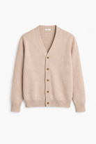 The cardigan is finished with ribbed detailing at the cuffs and hem, contributing to shape retention and edge stability. The knit surface presents a consistent texture without patterns, logos, or decorative elements.