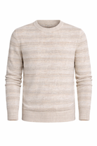 The sweater is produced with a textured knit surface that incorporates subtle horizontal patterning. Ribbed finishes at the neckline, cuffs, and hem support shape retention and a consistent structure without decorative elements or visible branding.
