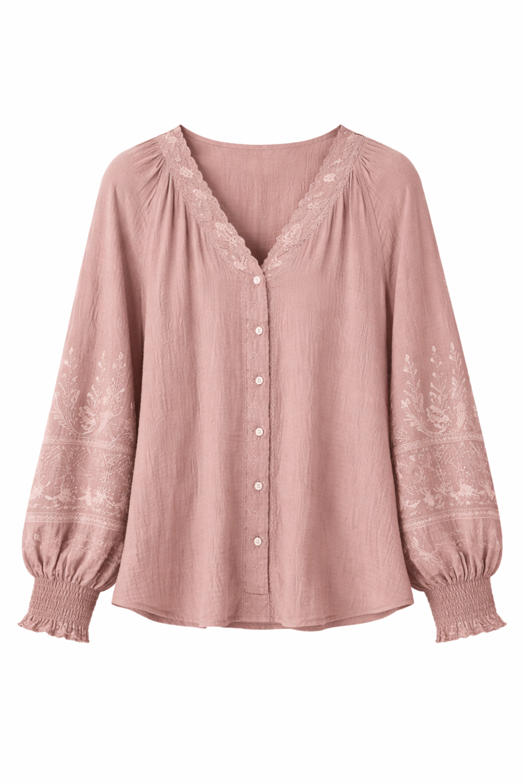 The shirt includes embroidered detailing along the sleeves and neckline, along with softly gathered shoulders and smocked sleeve cuffs. The fabric surface is textured and unbranded, with a straight hemline and balanced proportions.