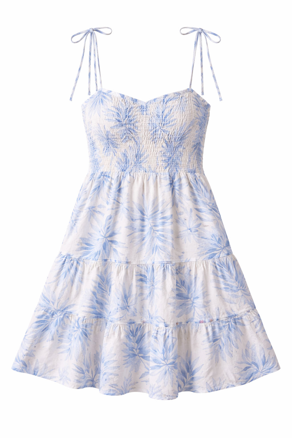 This women’s dress is constructed with a fitted smocked bodice and a tiered skirt structure. The design features adjustable shoulder ties and a sleeveless configuration suitable for apparel product listings.